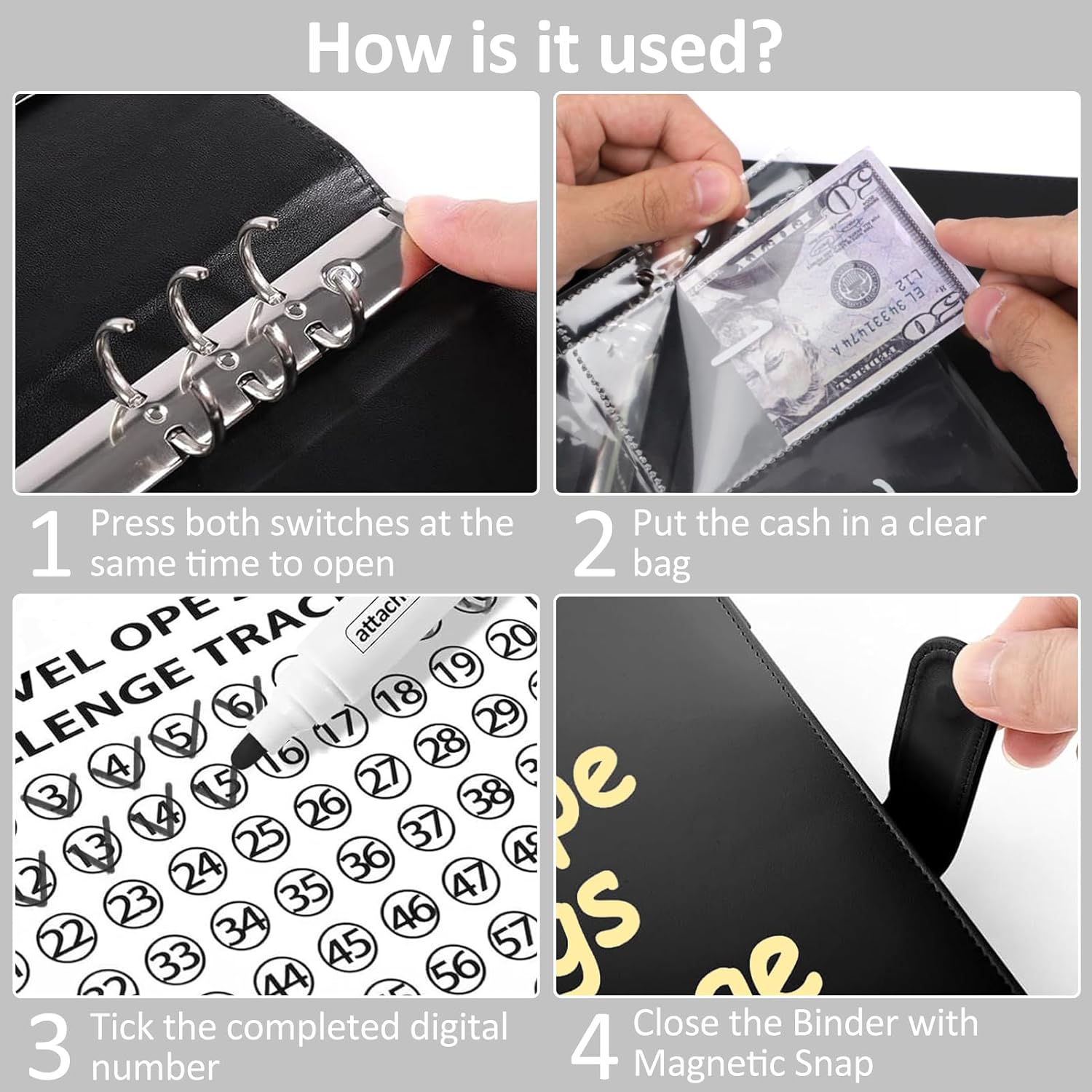 💰️【Diverse Savings Tracker】: Track your savings progress with the included savings tracker. These numbers correspond to the amount you deposited. When all numbers are marked, it means that your challernge is successful ! Compared to other similar products, we offer up to 4 challenge options to choose from, $500, 100 day, 30 day and 52 week challenges to suit your different needs for short or long term goals (like vacation, emergencies, etc.).