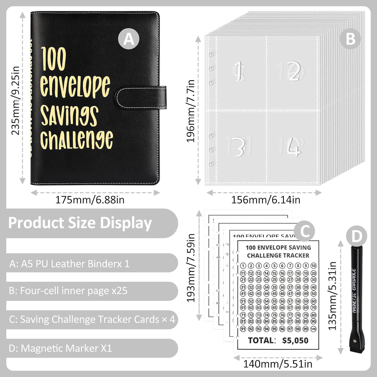 💰️【2024 Upgrade New 100 Envelope Challenge Kit】: 1×PU leather savings challenges book with card slot, cash wallet, 4×laminated reusable savings tracker for marking – $5050, 10100, 10000, 500, 1×25 pages 6-hole cash envelope with pre-printed 1-100 numbers that won’t fade over time, and 1×Dry-erase Magnetic Marker.