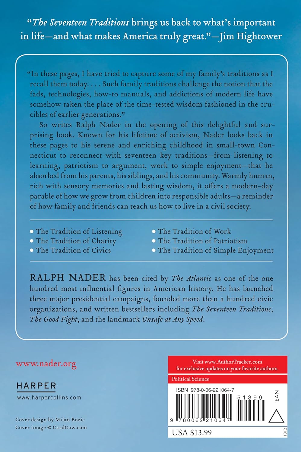 The activist, humanitarian, and former presidential candidate named one of the 100 most influential figures in American history by The Atlantic—one of only three living Americans so honored—Ralph Nader, looks back at his small-town Connecticut childhood and the traditions and values that shaped his progressive worldview. At once eye-opening, thought-provoking, and surprisingly fresh and moving, Nader’s The Seventeen Traditions is a celebration of uniquely American ethics certain to appeal to fans of Mitch Albom, Tim Russert, and Anna Quindlen—an unexpected and most welcome gift from this fearlessly committed reformer and outspoken critic of corruption in government and society. In a time of widespread national dissatisfaction and disillusionment that has given rise to new dissent characterized by the Occupy Wall Street movement, the liberal icon shows us how every American can learn from The Seventeen Traditions and, by embracing them, help bring about meaningful and necessary change.